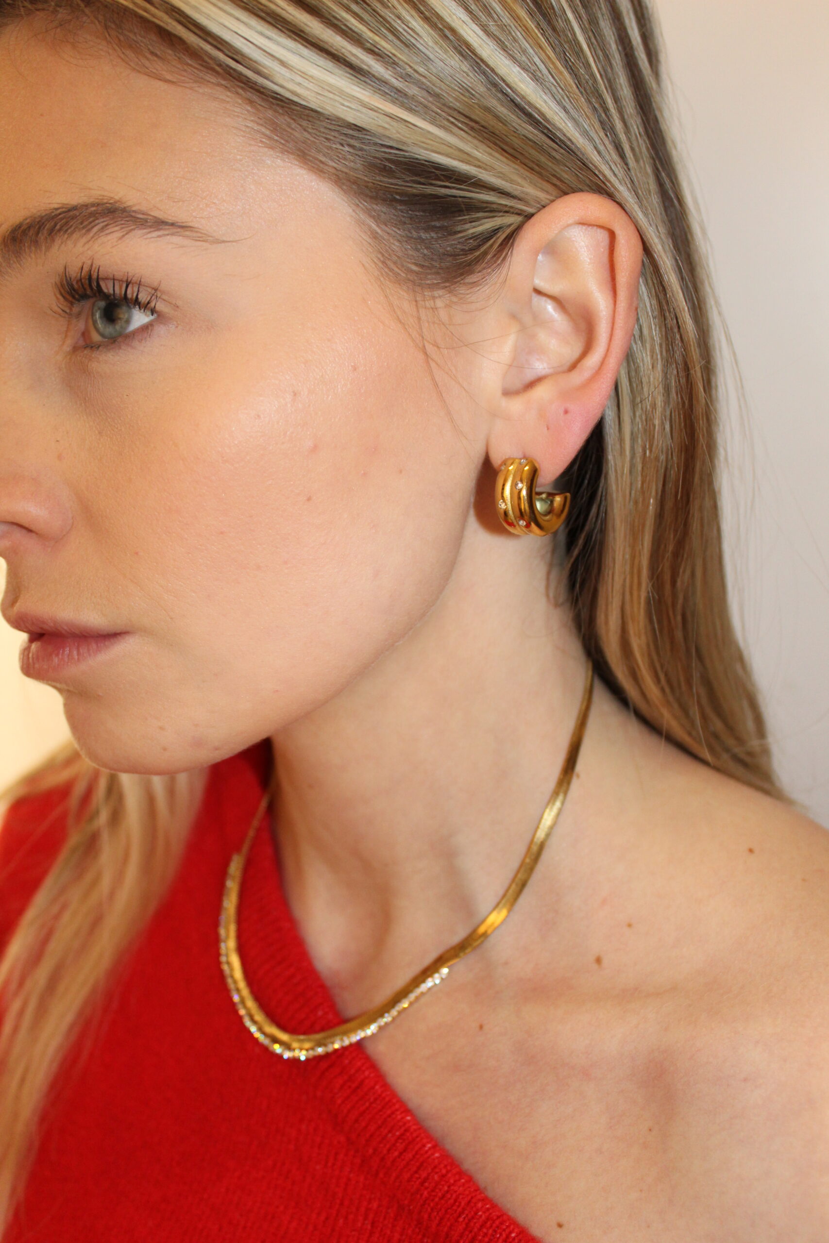 Orecchini doppia C con zirconcini, in acciaio inossidabile ed anallergico, placcati oro 18k.